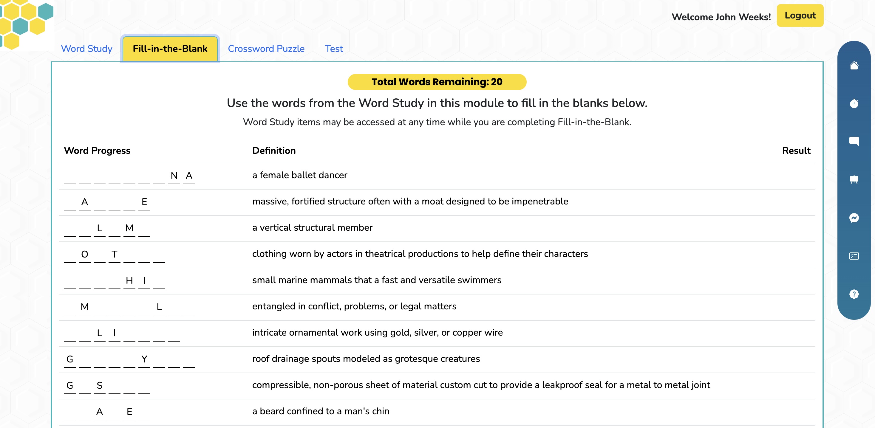 When you have completed your review of all 20 words in the module, the Fill in the Blanks game will appear on your screen.