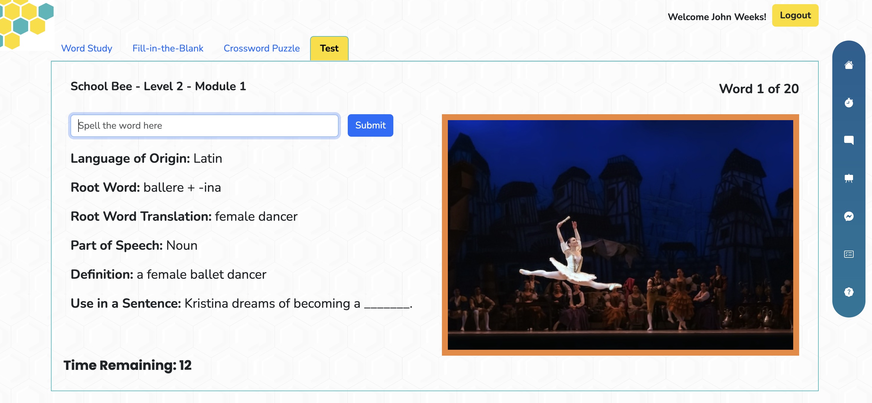 The definitions for the twenty words that you just reviewed are in the center. On the left side type are the missing letters for each word. On the far right, it will tell you if you have spelled each word correctly.